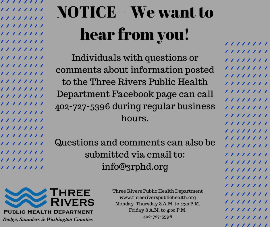 Binge drank in past 30 days. Two Rivers Public Health Department TRPHD in coordination with the Nebraska National Guard Nebraska Public Health Lab and the Nebraska Department of Health and Human Services will be offering COVID-19 drive through testing this week beginning on Wednesday May 13th.