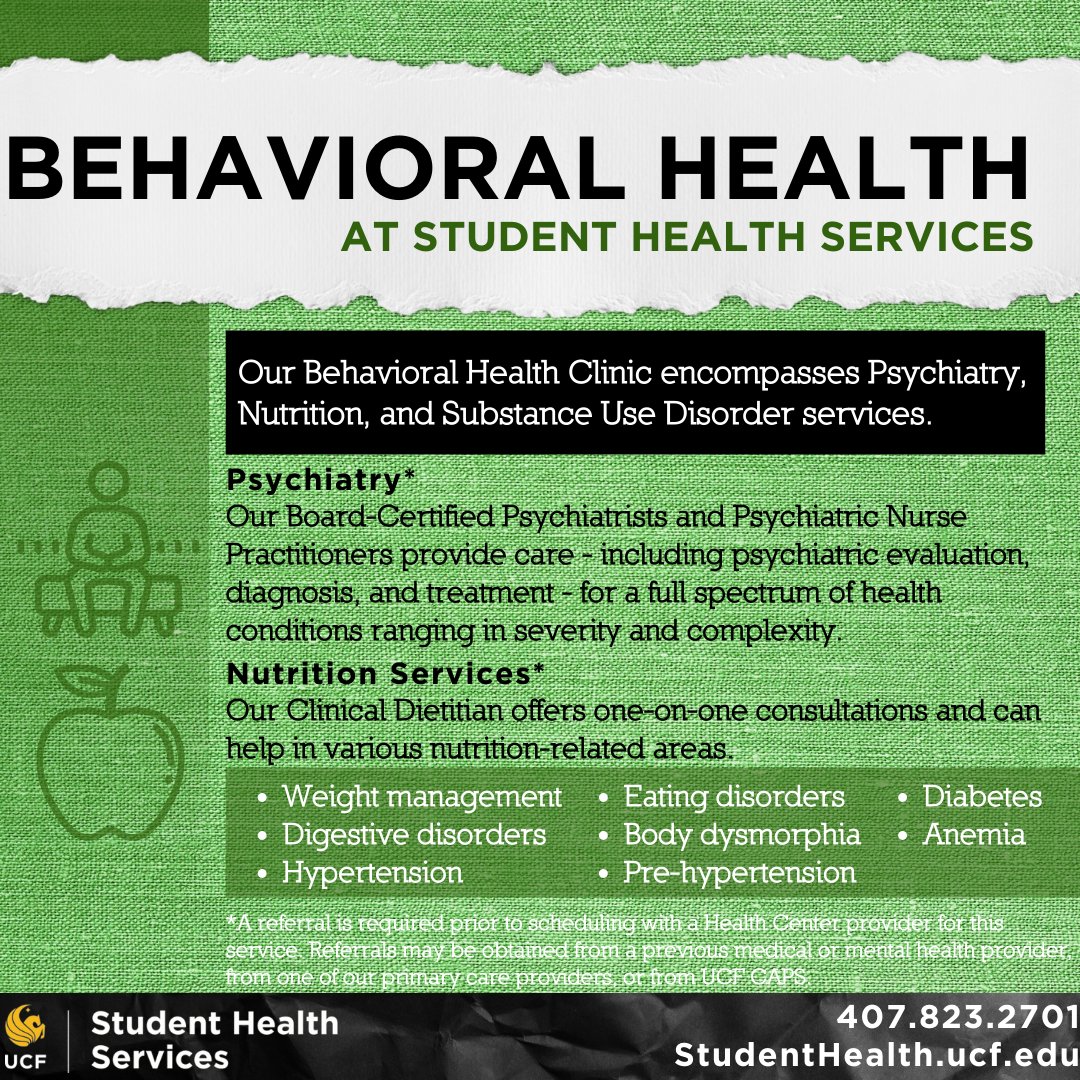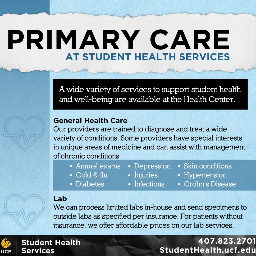 UCF Student Health Services provides a variety of primary and specialty care services to help keep students at their optimum health. The links belowabove are for the Faculty Community Practice only. The undergraduate health services administration program at the University of Central Florida is an upper-division professional curriculum leading to a Bachelor of Science degree.